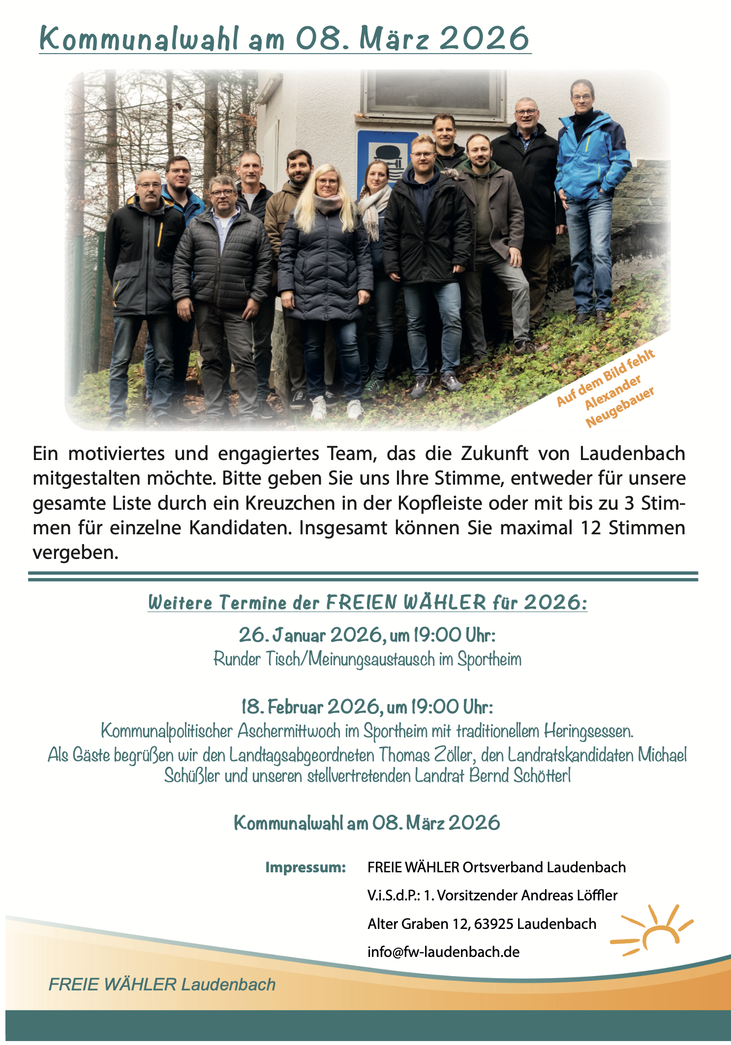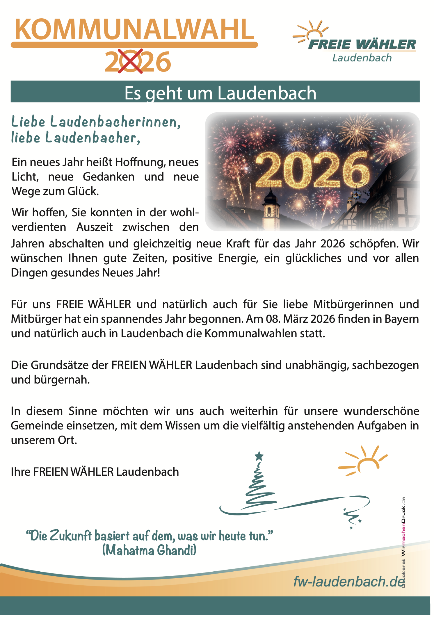 Auch im Wahljahr 2026 haben wir natürlich wieder einen Neujahrsflyer für die Laudenbacher Bürgerinnen und Bürger entworfen und bereits ausgeteilt.
